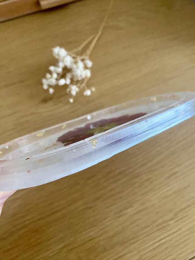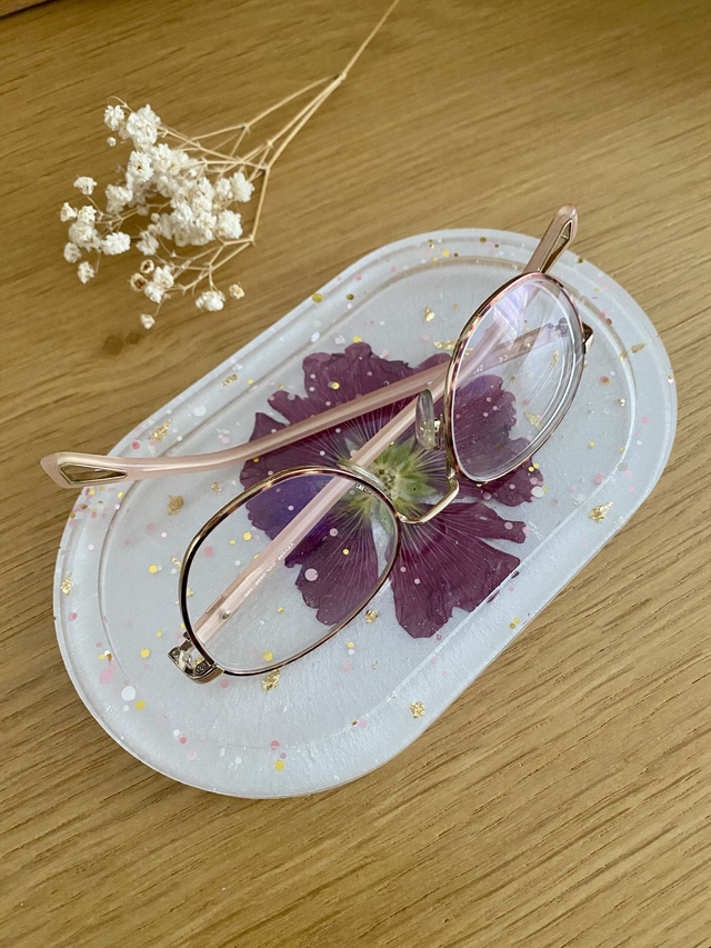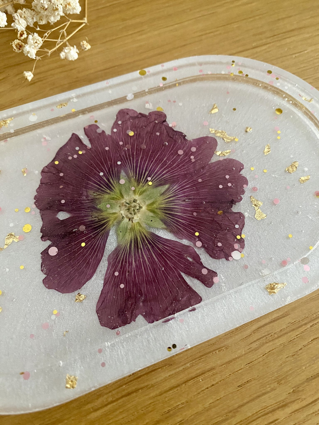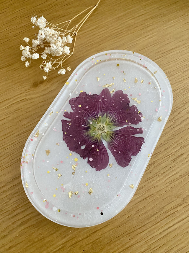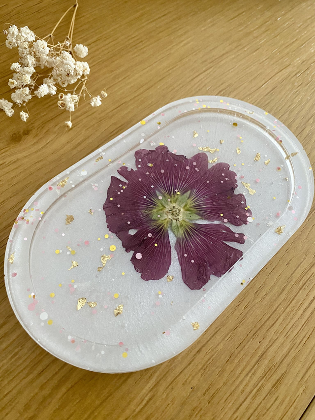 Vide poches ovale incrusté d'une rose trémière, flocons dorés, et paillettes rose et dorées, sur fond nacré.