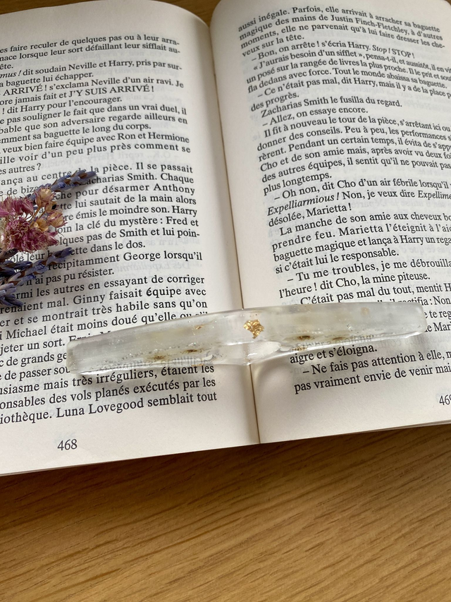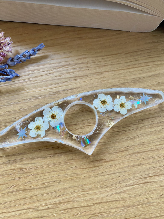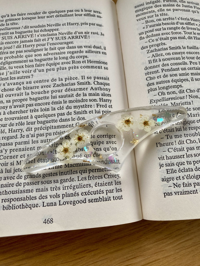 Bague de lecture incrustée de fleurs de spirée, étoiles holographiques et flocons dorés et blancs.