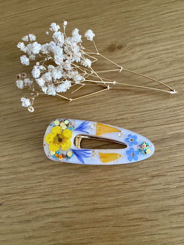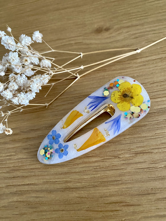 Barrette modèle Theresia, incrustée de fleurs de myosotis, bouton d'or, pétales de bleuet et rose d'Inde, paillettes samba et flocons dorés.