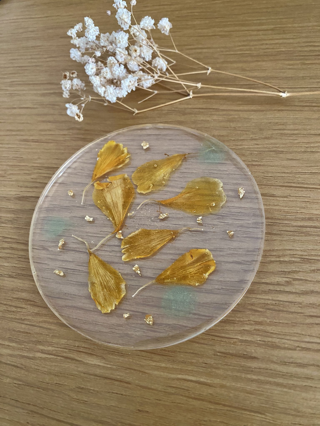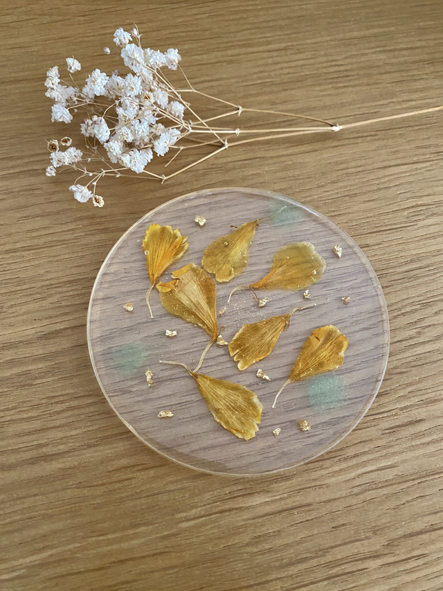 Dessous de verre rond, incrusté de pétales de rose d'Inde, pigments verts et flocons dorés.